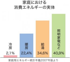 家庭でのエネルギー消費は、大きく分けて3つに分けられます。「冷暖房」「給湯」「照明・家電」です。